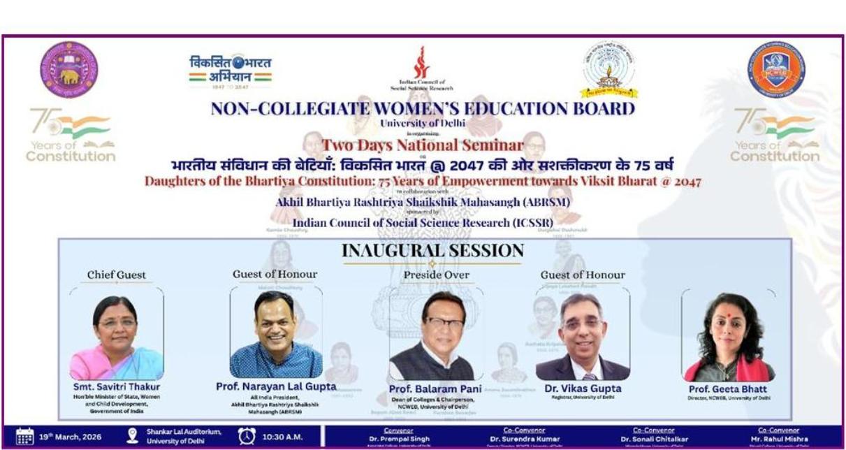 The establishment of the NCWEB by the Delhi University has given great opportunity to the girls/women of Delhi who were in a disadvantageous position to attend regular classes in colleges. The institute has arrangements of classes on every Saturday/ Sunday which is an ease for the girl students. I personally was in terms of getting admission in the regular board but when I got to know, my perspective of completing my graduation through regular college completely changed. I took admission in Keshav Mahavidyalaya (NCWEB) teaching center, and my experience of studying is tremendously amazing. It has helped to develop students to think, lead and change the world.