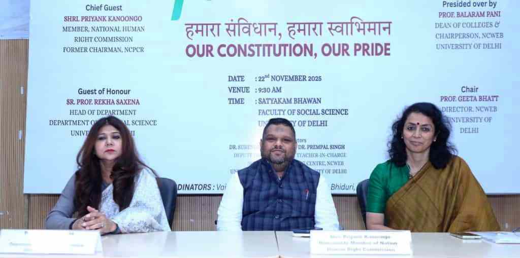 दिल्ली यूनिवर्सिटी (DU) के नॉन कॉलेजिएट वूमेन एजुकेशन बोर्ड (NCWEB) द्वारा संविधान के 75 वर्ष पूरे होने पर आयोजित समारोह में विशेषज्ञों ने संविधान की महत्ता, सामाजिक समानता और छात्राओं की भागीदारी पर महत्वपूर्ण विचार साझा किए.दिल्ली यूनिवर्सिटी (DU) के नॉन कॉलेजिएट वूमेन एजुकेशन बोर्ड (NCWEB) द्वारा संविधान के 75 वर्ष पूरे होने पर भव्य संगोष्ठी का आयोजन दिल्ली विश्वविद्यालय के सत्यकाम भवन में किया गया. हमारा संविधान, हमारा स्वाभिमान थीम पर हुई इस चर्चा में विशेषज्ञों ने संविधान की जीवंतता, समावेशी प्रावधानों और सिद्धांत व व्यवहार के बीच संतुलन की जरूरत पर गहरी बात रखी. मुख्य अतिथियों ने बताया कि संविधान सिर्फ कानूनों का संग्रह नहीं, बल्कि देश की लोकतांत्रिक भावना का दर्पण है. कार्यक्रम में छात्राओं की भागीदारी ने इसे और प्रभावी बना दिया